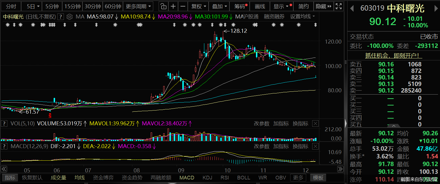 重组终止消息宣布后,中科曙光二级市场股价也遭受重挫。12月10日,中科曙光股价跌停开盘,开盘后短暂打开跌停板,不过早盘再度封上跌停。截至当日收盘,中科曙光股价报跌停价90.12元/股,总市值1319亿元。